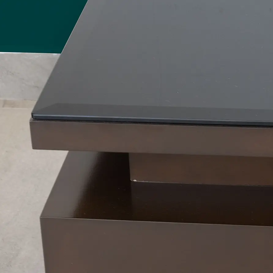 La Mesa Mónaco destaca por su estructura robusta de madera en tono oscuro y su cubierta de cristal que refleja sutilmente la luz, creando una sensación de amplitud y equilibrio visual.