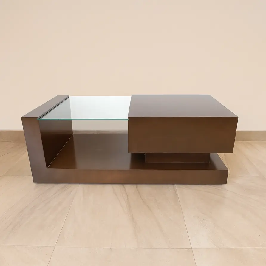 La Mesa de Centro Sultana destaca por su estructura en madera con acabado oscuro y una cubierta parcial de cristal, creando un contraste visual que equilibra ligereza y solidez.