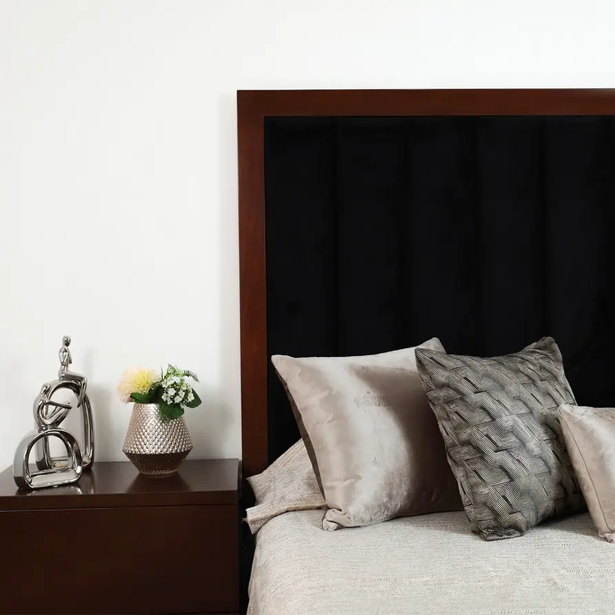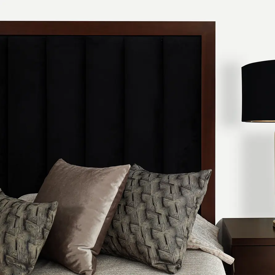 Esta recámara combina elegancia y modernidad con un diseño sofisticado que destaca por su cabecera acolchonada y acabados en madera.